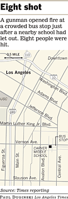 February 28, 2008 - Five children and three adults were shot Wednesday afternoon by a gunman who opened fire at a busy South Los Angeles bus stop minutes after classes were dismissed at a nearby school.